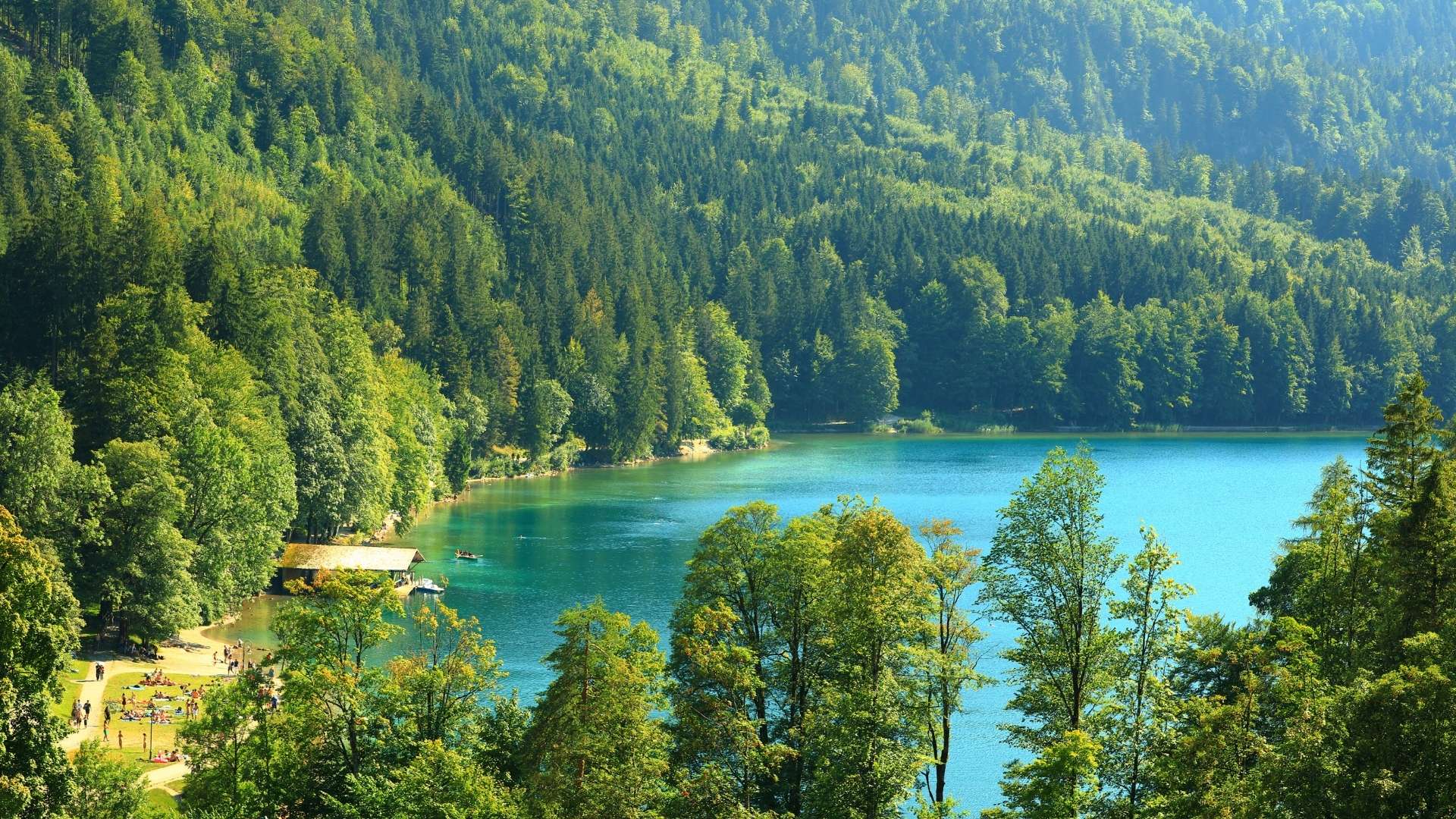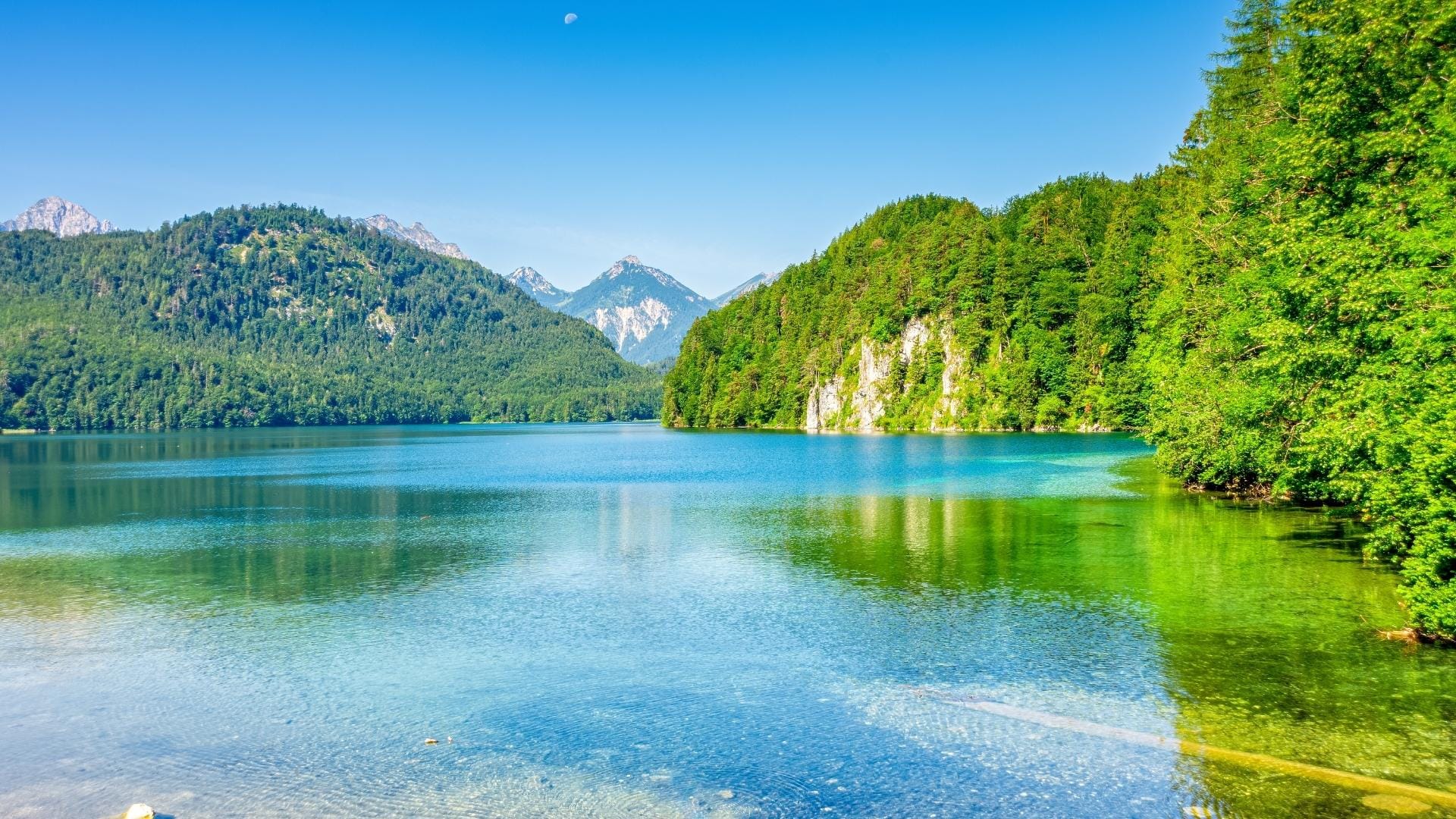 Die meisten Besucher kommen wegen der Schlösser nach Schwangau. Dabei ist der Alpsee direkt unterhalb von Neuschwanstein und Hohenschwangau mindestens genauso sehenswert. Der See in den Allgäuer Alpen ist 1,9 km lang, und sein Wasser wechselt je nach Licht zwischen tiefem Blau und hellem Grün.