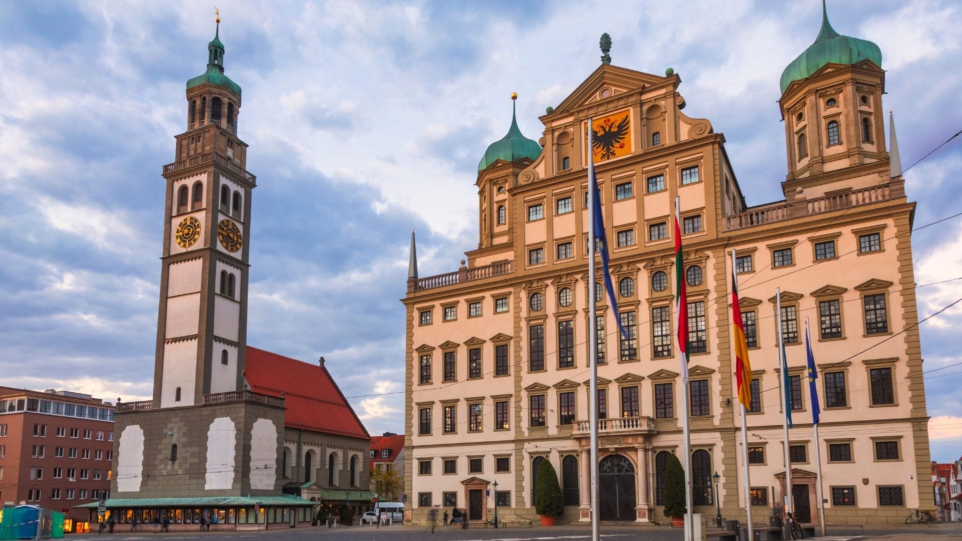 Bei Föhnwetter kannst du von hier oben sogar bis zu den Alpen sehen. Der Perlachturm beherbergt außerdem ein Glockenspiel aus 35 Glocken, das mehrmals täglich Melodien erklingen lässt. Wenn du zur richtigen Zeit da bist, gibt es also auch etwas auf die Ohren. Jedes Jahr im September wird am Turm das traditionelle „Turamichele“ gefeiert, bei dem ein mechanischer Erzengel den Teufel besiegt. Versäume nicht, den Perlachturm zu erklimmen und Augsburg aus der Vogelperspektive zu erleben – dieser Ausblick bleibt unvergesslich.