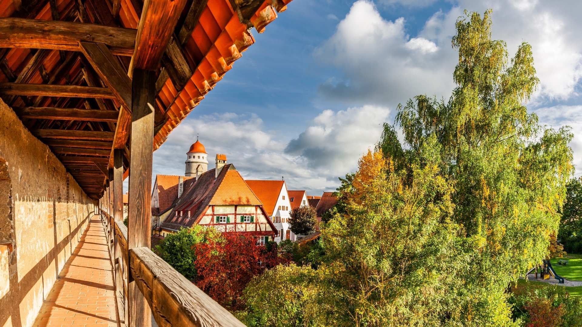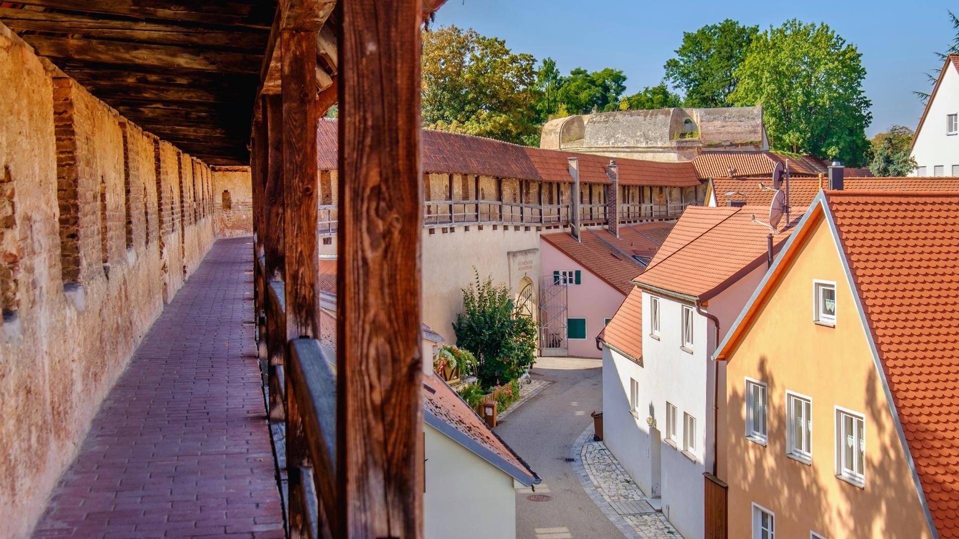 Die Stadtmauer von Nördlingen ist etwas Besonderes, denn sie ist vollständig erhalten und komplett begehbar. Auf dem überdachten Wehrgang umrundest du die Altstadt einmal ganz, Schritt für Schritt. Dabei eröffnen sich immer neue Blicke auf Dächer, Gärten und Türme.