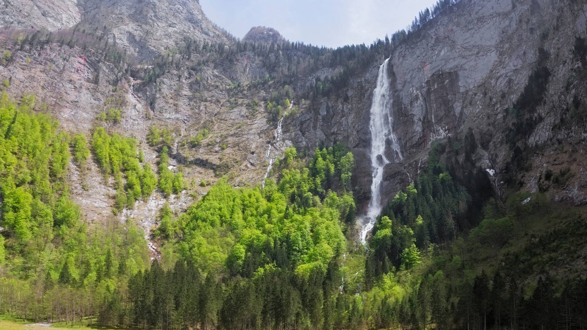 Der Röthbachfall ist der große Maßstab in Bayern. Mit rund 470 Metern Fallhöhe gilt er als höchster Wasserfall Deutschlands und stürzt in zwei Hauptstufen fast senkrecht ins Tal. Am Obersee führt der Weg entlang steiler Felswände bis in den hintersten Talschluss, wo der weiße Wasserfaden plötzlich an der Wand hängt. Die obere Hauptstufe überwindet nahezu frei rund 240 Meter, bevor die unteren Abschnitte das Wasser weiter ins Becken führen. Durch die Lage im Nationalpark Berchtesgaden blieb das Naturdenkmal weitgehend unverbaut. Eine Uferwanderung von etwa drei Kilometern macht aus dem Besuch ein kleines Abenteuer. Direkt am Seeufer.