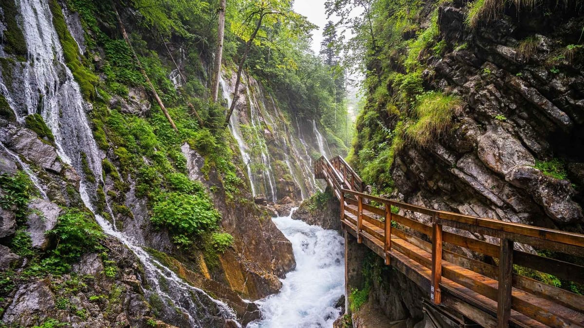 Diese Wasserfälle sind ein Hochgefühl aus Wasser und Höhenmetern. Der Zipfelsbach stürzt über Felsen rund 300 Meter in die Tiefe und wirkt dadurch eher wie eine ganze Fallreihe als wie ein einzelner Sprung. Ausgangspunkt ist Hinterstein, von dort führt eine Wanderung zum Wasserfall und wieder zurück; die Route gilt als mittelschwer und bringt etwa 330 Höhenmeter auf rund 8,5 Kilometern zusammen. Unterwegs wechseln Waldpassagen und offene Stellen, an denen das Rauschen schon vorher durchdringt. Am Ziel steht man vor kühler Gischt, hört das Dröhnen in der Schlucht und merkt, wie schnell die Umgebung den Takt vorgibt. Das wirkt sehr direkt.